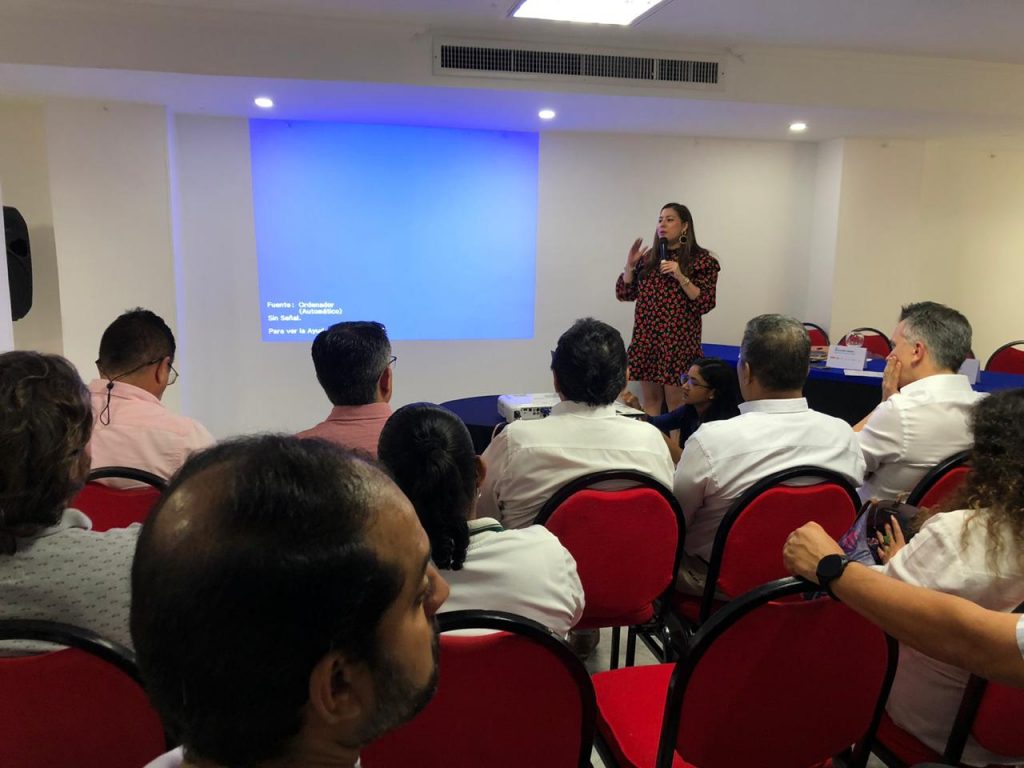 Cuatro panelistas, asistentes y presentadora en el auditorio de Corpamag durante el foro de negocios verdes y los retos de la economía circular.